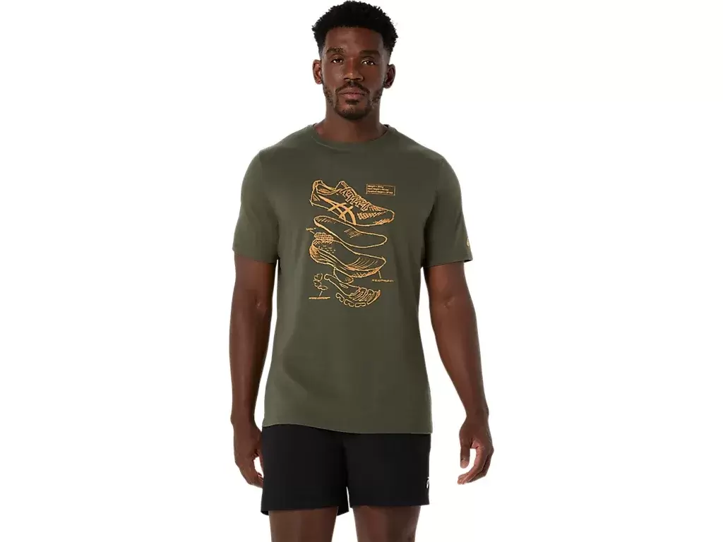 This comfortable knit short sleeve tee takes inspiration from performance ASICS running shoe sketches. It’s stamped with a front graphic that features the various components used to build our running shoes.