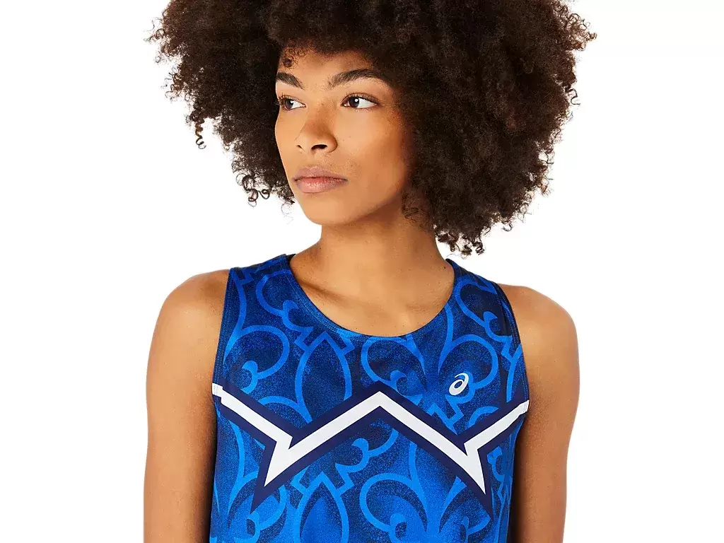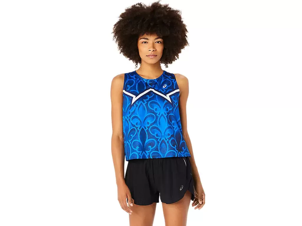 The singlet features iconic symbols and is colored to represent three nations, Japan, France and the US.